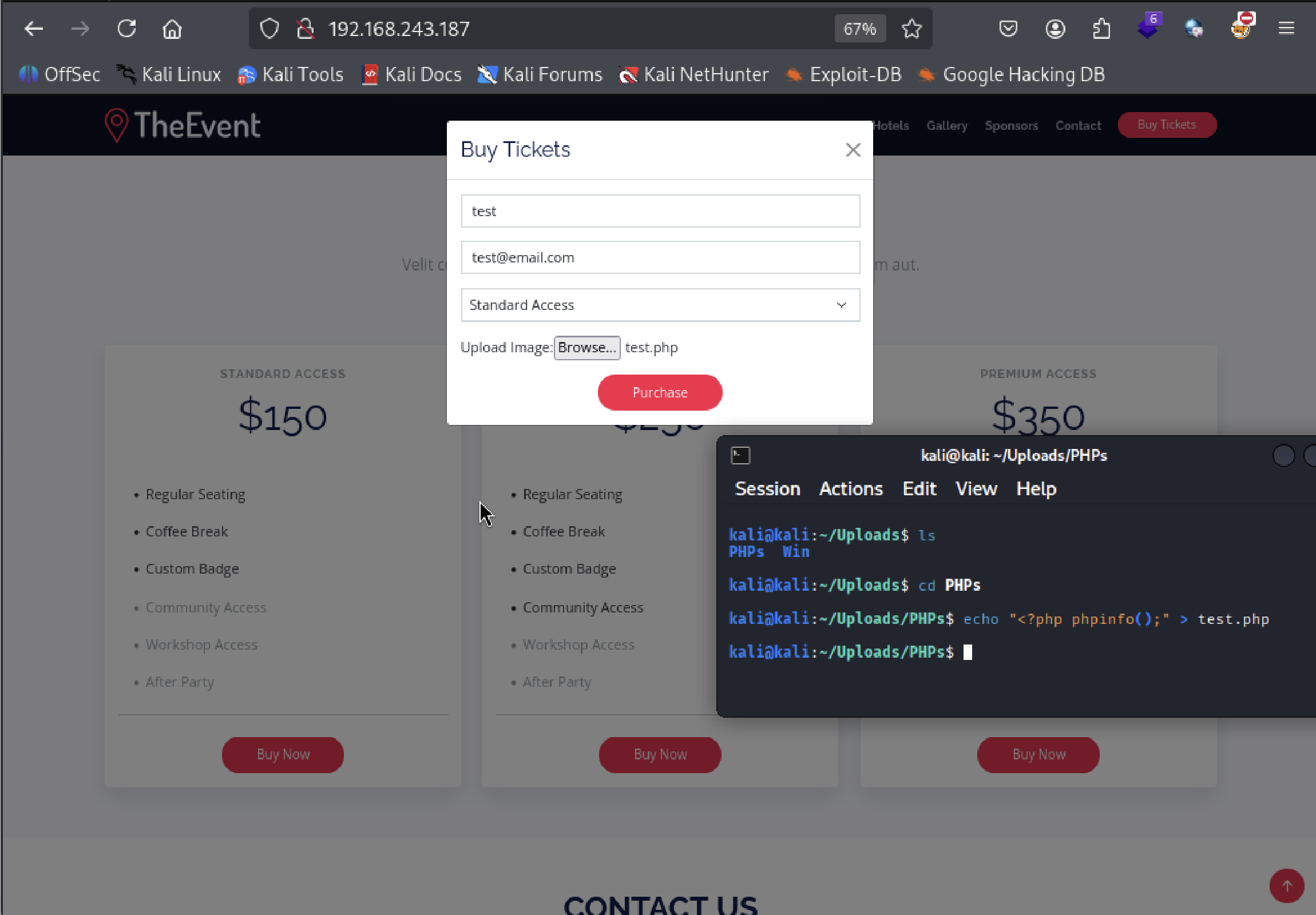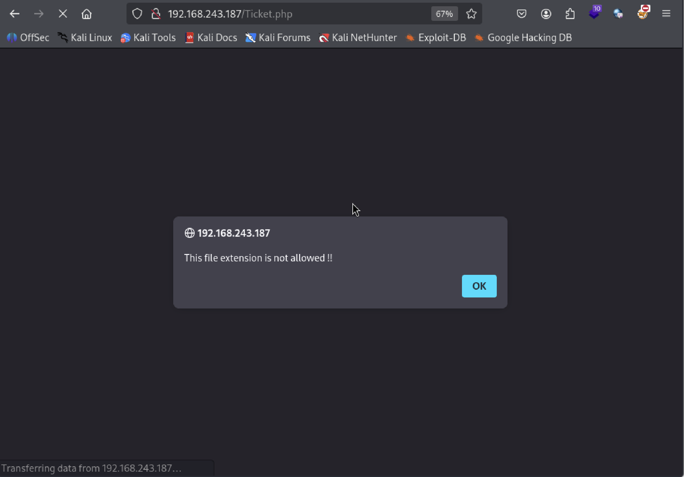 The webpage revealed a file upload feature. It appeared to be restricted, as multiple PHP-related extensions e.g..php, .phtml, and .phar were rejected.
