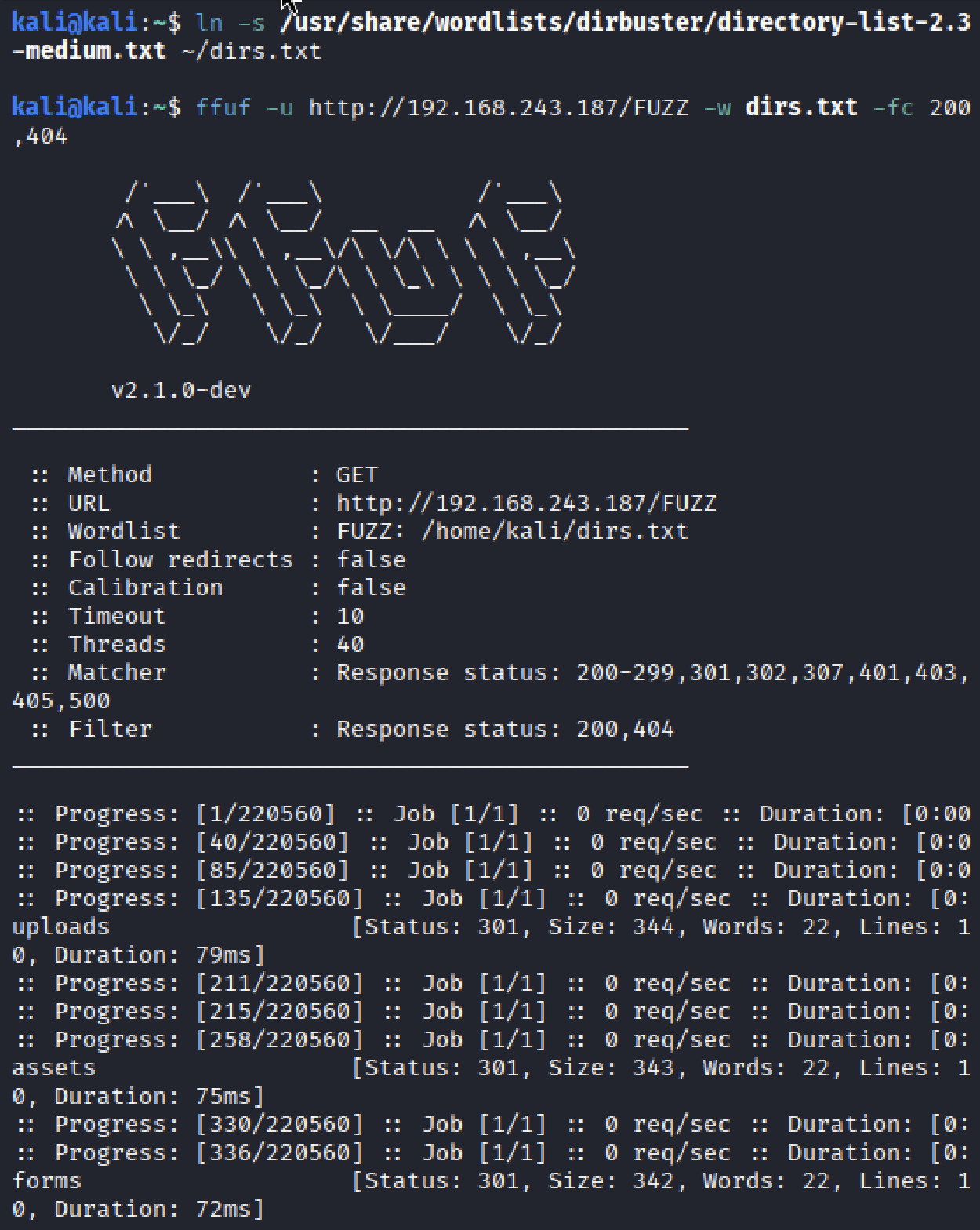 This is where ffuf comes in. I filtered out 200 and 404 responses to reduce noise. While 200 can sometimes matter, modern apps often return it for everything. The output isn’t pretty, but the 301 populated in few top rows: uploads, assets, and forms.