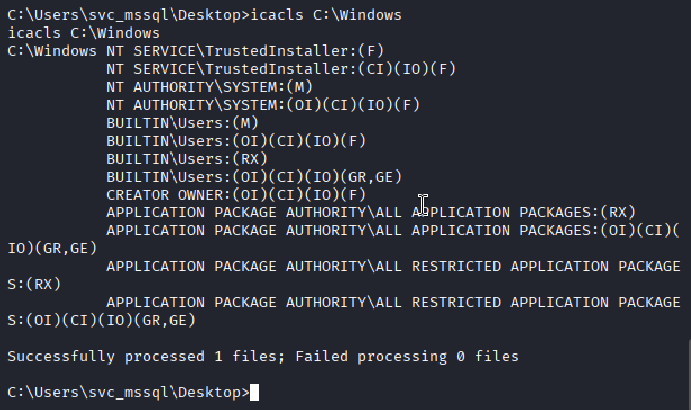 icacls confirmed NT AUTHORITY\SYSTEM and TrustedInstaller with Full Control. System32 becomes writable, allowing payload placement in trusted locations and service-level execution to complete the escalation.