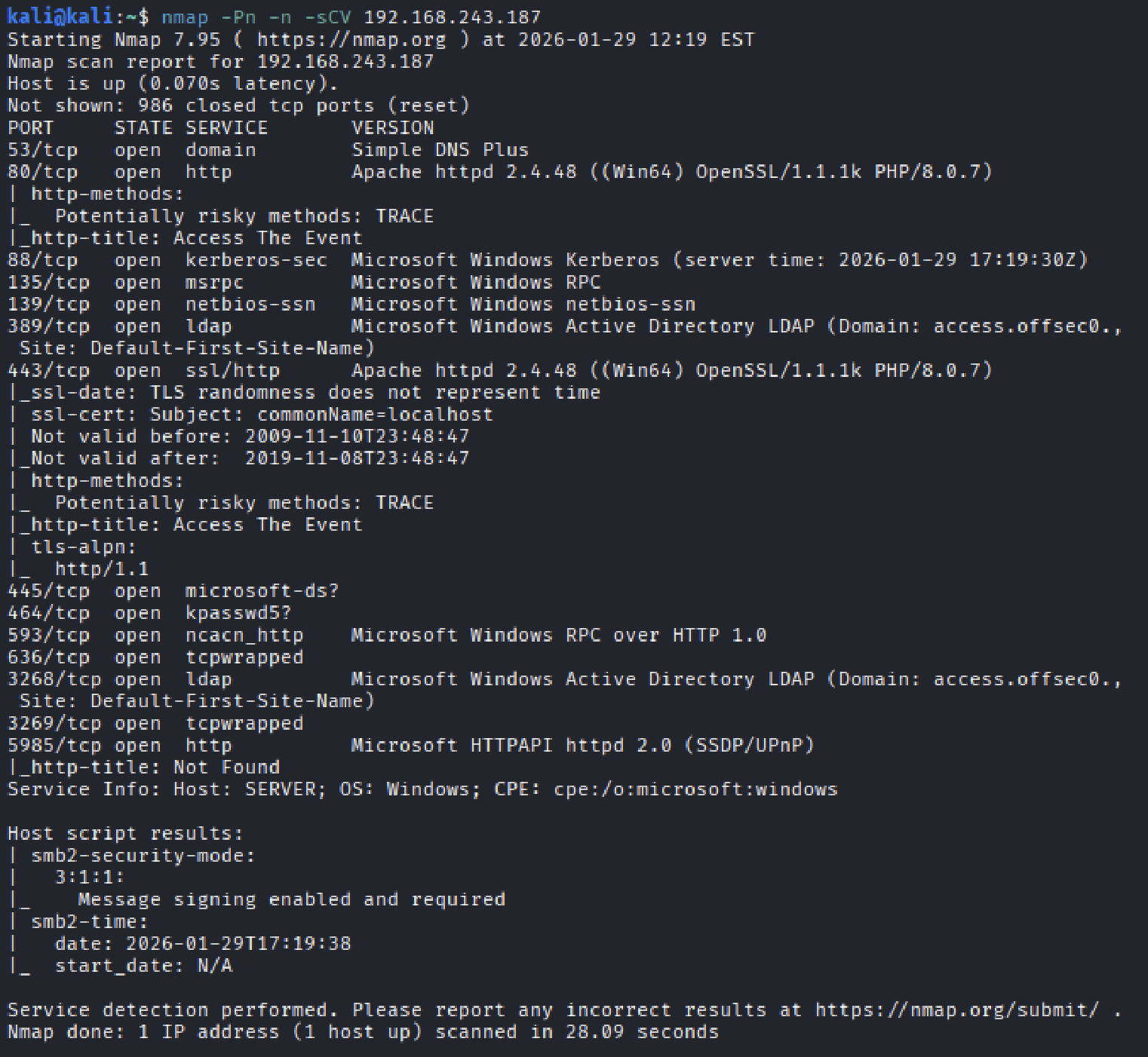 Nmap revealed an Active Directory machine. Port 80 stood out immediately, PHP on Windows has historically widened the attack surface. When a domain controller also runs a web app, the web layer is usually the open gap.