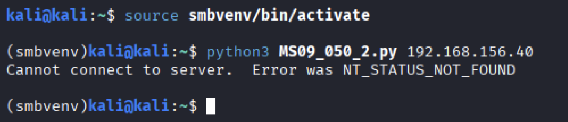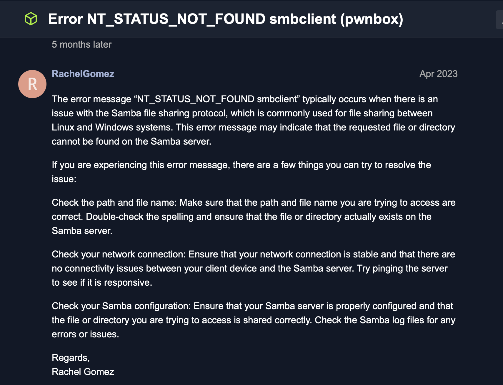 The only hint in the comment referenced python2. While python2 itself could not be installed, python2.7 was available and installed system-wide, along with get-pip.py and pysmb. This approach did not succeed. After reverting to Python3 and retrying, the result was an NT_STATUS_NOT_FOUND error, even though the listener reported a connection. I dug a bit more and came across a relevant comment on the HTB forum by Rachel Gomez.