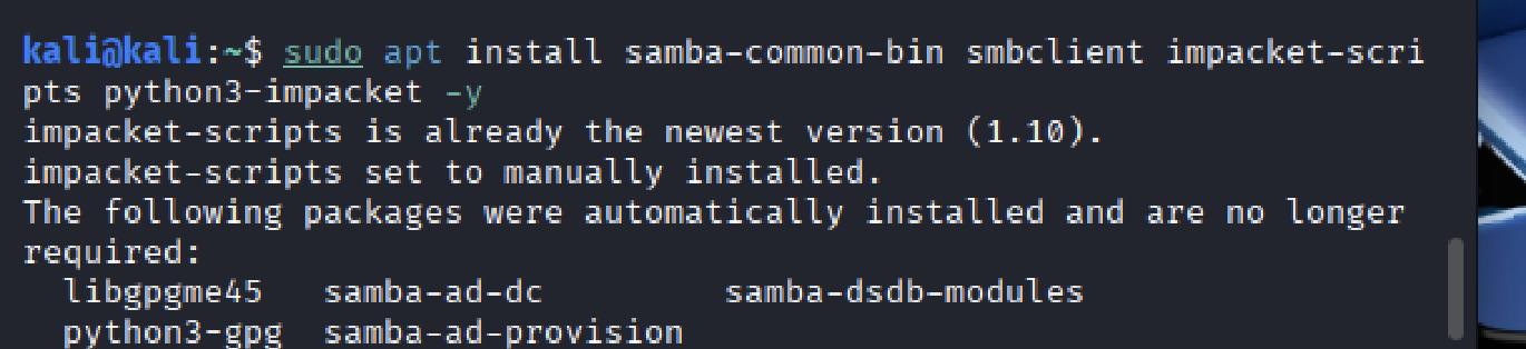 This pointed away from network reachability and toward how the client interacted with the server. On Debian-based systems, this raised suspicion of missing client-side SMB tooling. The package most likely responsible appeared to be samba-common-bin. Additional packages such as smbclient, impacket-scripts, and python3-impacket were installed to eliminate other variables.