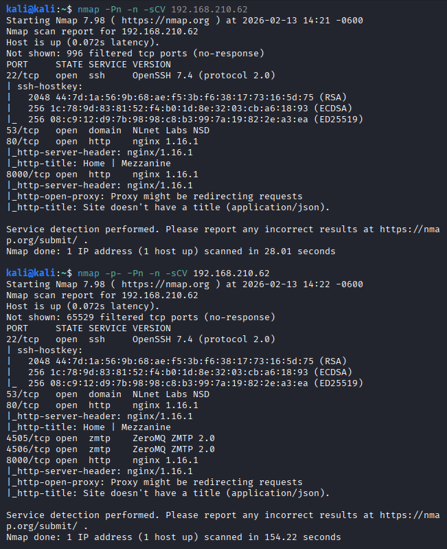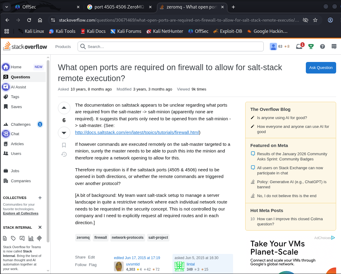 Sometimes -p- is necessary depending on scope. The first nmap scan did not reveal ports 4505 and 4506. A full port scan did.