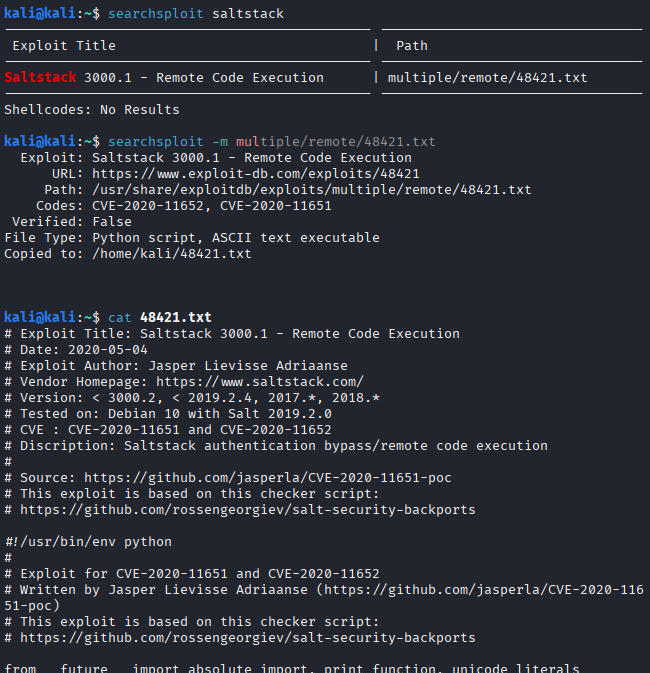 A quick searchsploit saltstack confirmed public exploits.
